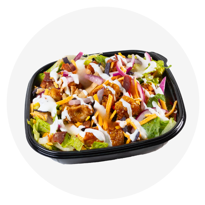 Oven-baked chicken, bacon, cheddar, red onion, tomatoes, romaine, and Habanero Ranch Rub. Served with Ranch