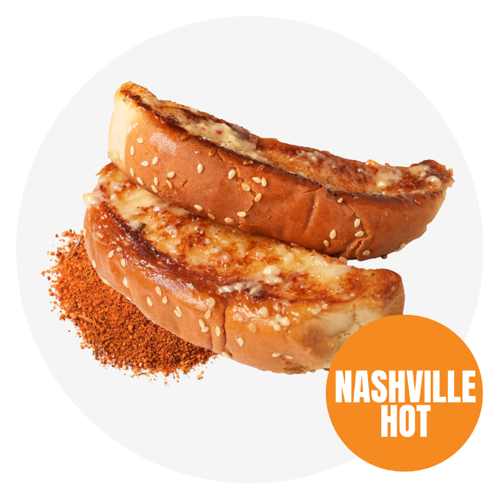 Soft, buttery toast brushed with garlic butter and topped with Nashville Hot rub. Allergens: Milk, Wheat, Soy, Sesame