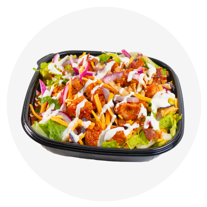 Chicken tossed in your choice of flavor, cheddar, tomato, red onion, romaine. Choice of dressing.