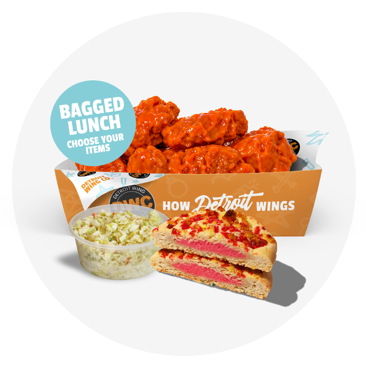 Minimum of 6: Each Bagged Lunch includes: Your choice of 5 wings (boneless or classic) or chicken wrap, coleslaw, and a cookie.